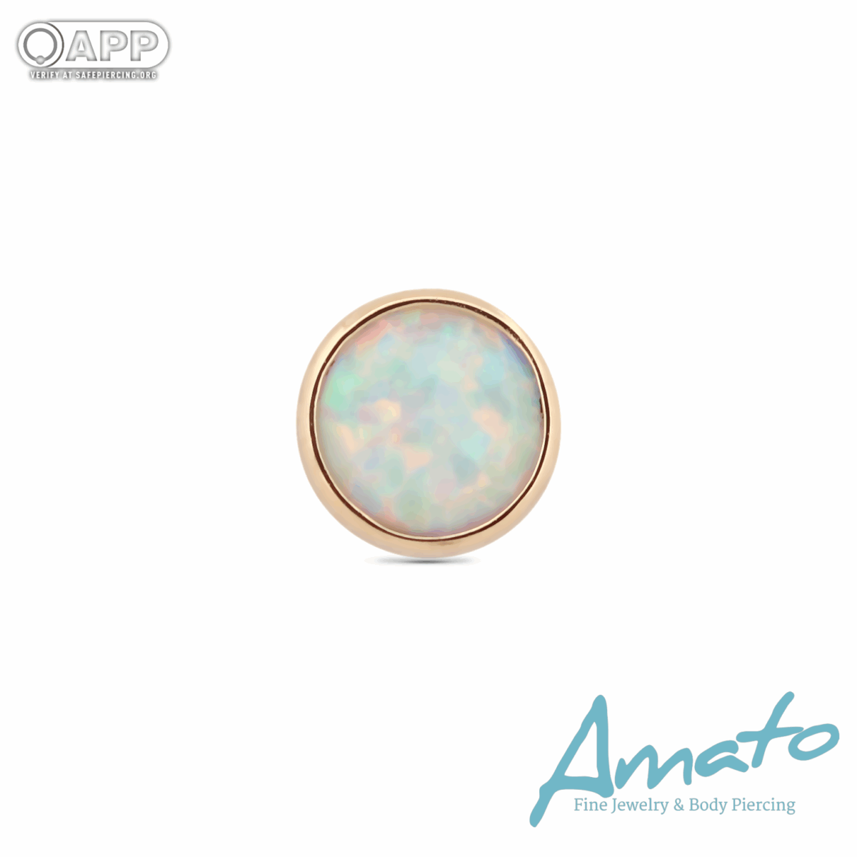 Sleek, luminous, and endlessly versatile. This piece features a smooth round white opal set in a polished 14k yellow gold bezel, offering a low-profile design that glows with subtle iridescence. Its refined simplicity makes it an essential piece for any piercing curation. Available in 3mm and 4mm.