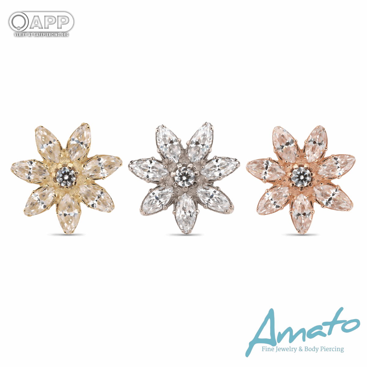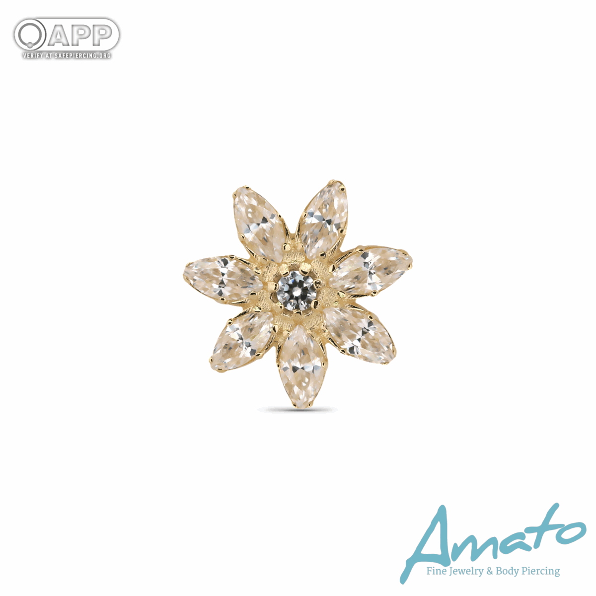 A radiant floral design that captures timeless elegance. This features a cluster of marquise-cut sparkling gemstones arranged in a delicate bloom, centered with a brilliant round stone for added sparkle. Its refined symmetry and dazzling brilliance make it a standout piece for any piercing.