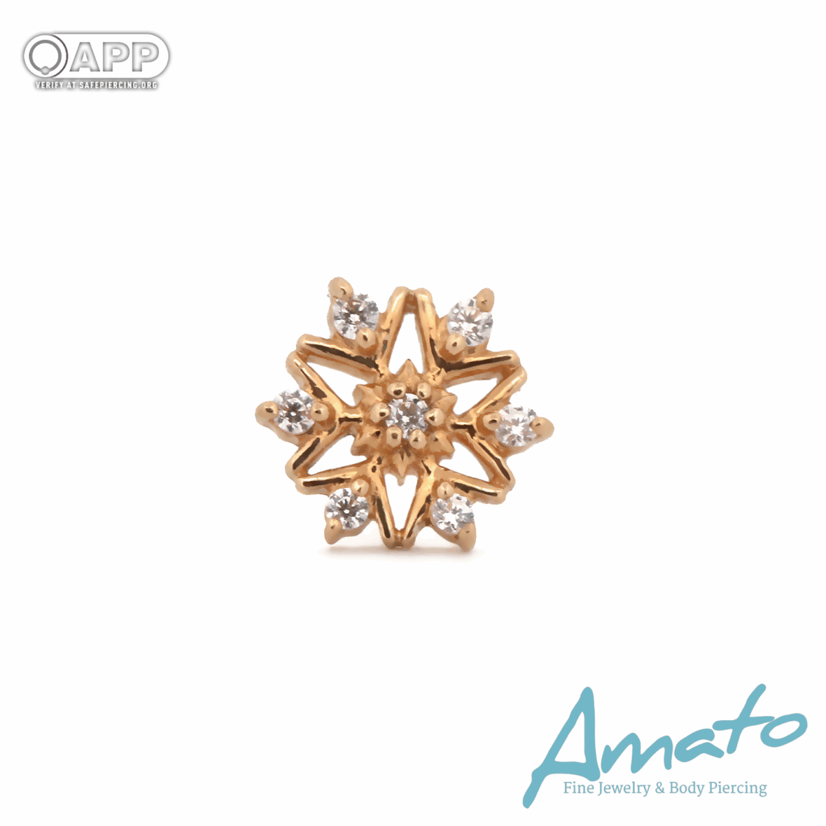Radiant and refined, this intricate snowflake-inspired design adds a touch of sparkle to any piercing. Crafted in solid 14K gold and accented with shimmering clear stones, it captures light beautifully from every angle — a perfect blend of elegance and brilliance.